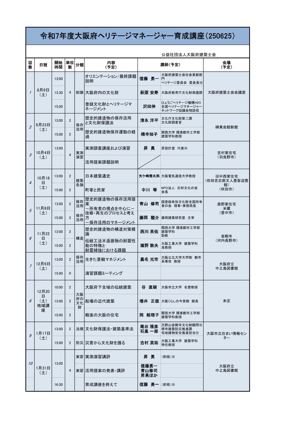 令和7年度大阪府ヘリテージマネージャー育成講座に今年も藤岡が登壇します。