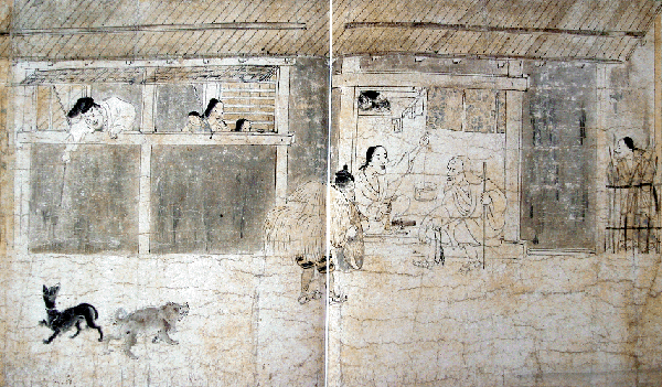信貴山縁起絵巻には12世紀頃の庶民の家が描かれています。屋根は板葺きで壁は土壁。戸口は大きく開かれ、土間では家人が糸を紡ぎながら敷居に腰掛けている人と何やら会話をしています。その戸口は片引きではなく、おそらく昼間は開け放してのれんを掛け夜は閉めるという跳ね上げの板戸、いわゆる大戸と呼ばれているものであろうと想像できます。そして、横の居室の窓からは母親と子供達が外の吠える犬を覗き、父親であろう主人が犬をなだめるている様子が描かれています。その窓の建具は廻りの桟に縦横十字に組子を通しその裏に薄い割板を貼った木連格子の板戸で非常に簡単な構造になっています。上部の吊り元を突き上げ棒で支えてある、いわゆる蔀戸を吊った高窓になっています。昼間は外へはね上げ棒で支えている突き上げ窓です。夜はその棒をはずし、雨戸、板戸として防犯の役目も果たしています。また、内部には横桟の舞良戸がはめられており、総じて簡単で経済的な造りに感じられます。通りに面した壁は、開口部分より壁が多くわりあいに閉鎖的な町家に感じられます。